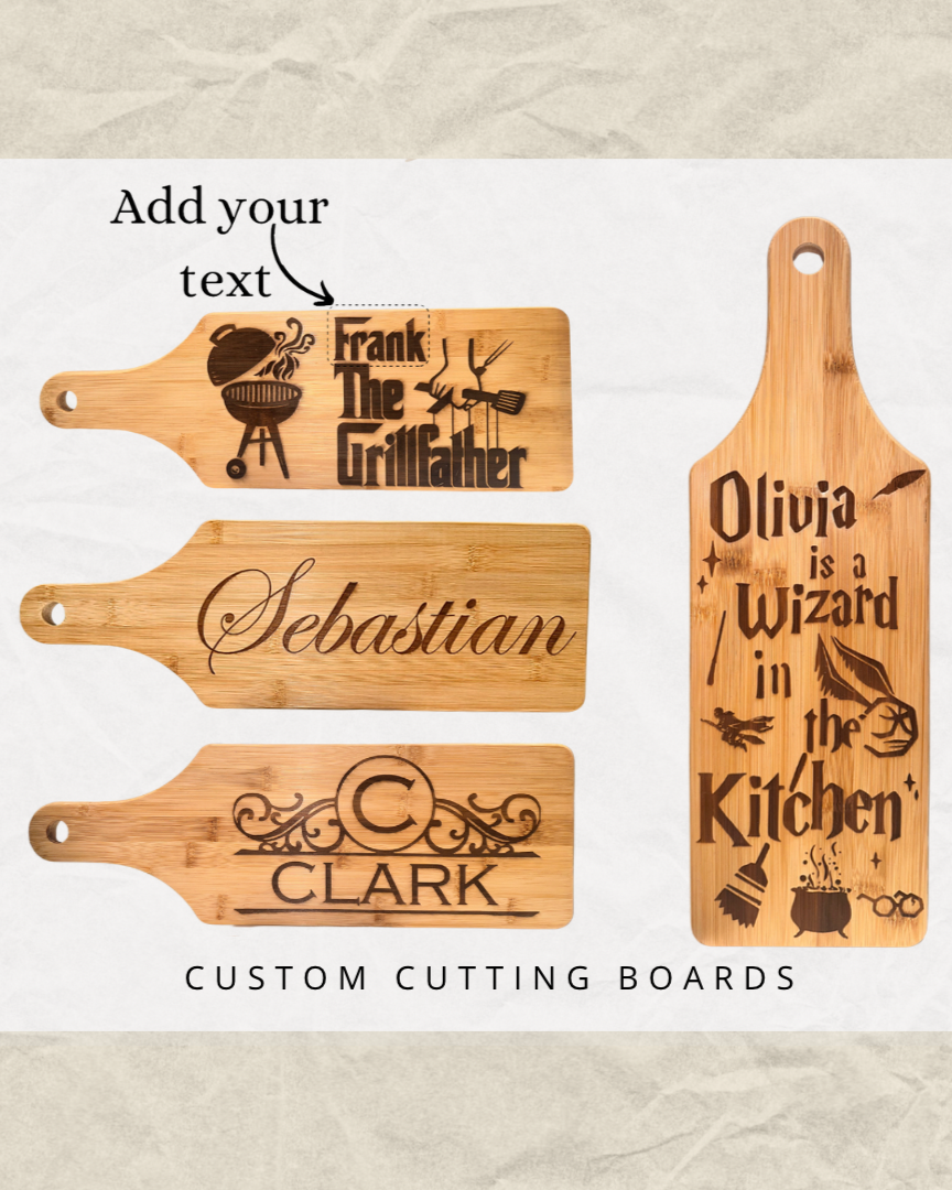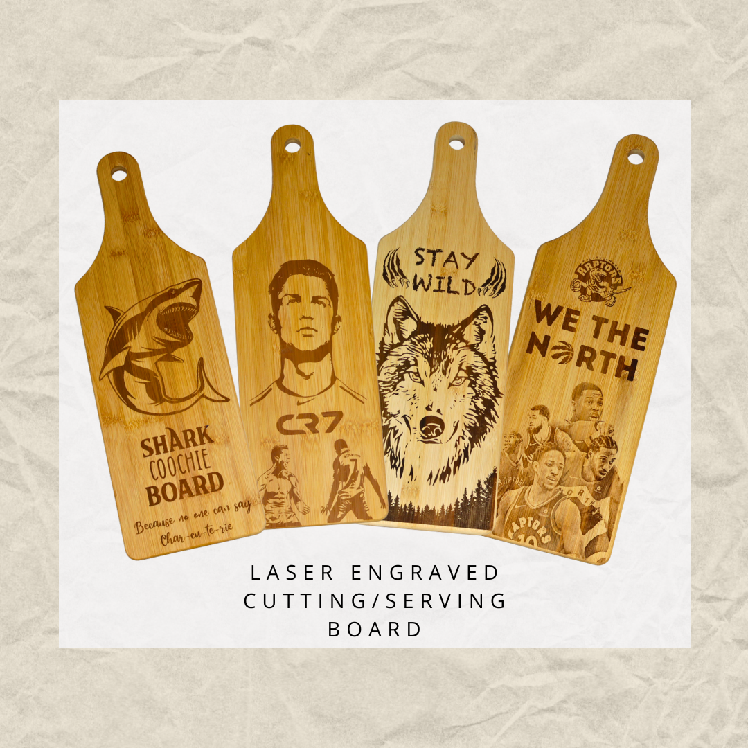 Discover our exquisite collection of bamboo cutting/serving boards, available in pre-made designs or customizable options. Each board is meticulously engraved with laser precision, ensuring the highest quality and durability. Elevate your culinary experience with our premium bamboo boards, perfect for both practical use and gifting.